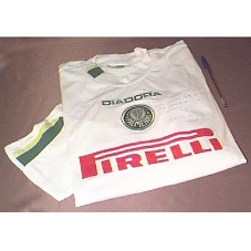 CAMISETA BRANCA (TAM. GG), DO PALMEIRAS. NA FRENTE, BORDADO EM VERDE A PALAVRA 'DIADORA' E O EMBLEMA DO PALMEIRAS E PINTADO EM VERMELHO 'PIRELLI'. NAS COSTAS, EM VERMELHO 'PIRELLI' E EM VERDE O NÚMERO 10 E 'DIADORA'. NAS MANGAS, DETALHE VERDE E AMARELO.