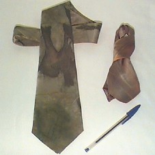 DUAS GRAVATAS EM TECIDO ESVERDEADO. A PRIMEIRA, COMUM. A SEGUNDA, UMA MINIATURA. ACONDICIONADAS EM SACOLA DE CETIM PRETO, COM FAIXA DO MESMO TECIDO DAS GRAVATAS COSTURADA NA PARTE SUPERIOR.