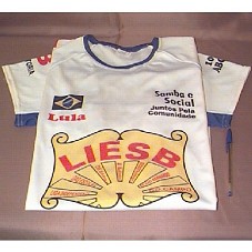 CAMISETA (TAM GG) EM MALHA BRANCA, COM FAIXAS AZUIS NAS LATERAIS E NAS MANGAS. NA FRENTE, 'LIESB / LIGA INDEPENDENTE DAS ESCOLAS DE SAMBA E BLOCOS CARNAVALESCOS DE SÃO BERNARDO DO CAMPO / GESTÃO EDER FRANÇA / OUSAR LUTAR OUSAR VENCER', COM A BANDEIRA DO BRASIL NO LADO SUPERIOR ESQUERDO E 'LULA'; DO OUTRO LADO, 'SAMBA E SOCIAL / JUNTOS PELA COMUNIDADE'. ATRÁS, FIGURA DE UM CASAL DANÇANDO E 'NÓIS INVERGA MAIS NÃO QUEBRA / SE LIGA NA LIGA / SAMBA E PAZ / CARNAVAL 2004 / S.B.C. / A LIGA É DEZ / BRASIL É MIL / FOME É ZERO'.