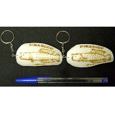 DOIS CHAVEIROS CONFECCIONADOS COM ESCAMA DO PEIXE PIRARUCU. ACOMPANHA UM BILHETE COM A INSCRIÇÃO 'CHAVEIRO FEITO DA ESCAMA DO PEIXE PIRARUCU / SERVE PARA LIXAR AS UNHAS / AI VAI UM PARA O PRESIDENTE LULA E OUTRO PARA A 1ª DAMA DO BRASIL DONA MARISA. / CHICO BRITO PESCADOR'.