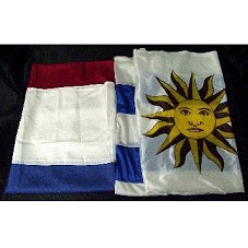 DUAS BANDEIRAS, SENDO UMA DO URUGUAI (155X100 CM) E OUTRA NÃO IDENTIFICADA (135X81 CM), COM TRÊS FAIXAS HORIZONTAIS NAS CORES BRANCA, AZUL E VERMELHA.