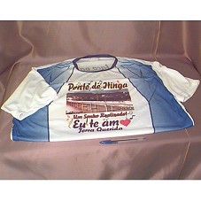 CAMISETA (TAM GG) EM MALHA BRANCA COM FAIXA AZUL NAS LATERAIS, DE MANGA CURTA. NA FRENTE, ESTAMPA COM FOTO DE UMA PONTE E 'PONTE DE ITINGA/ 2004 / UM SONHO REALIZADO! / EU TE AMO TERRA QUERIDA'. ATRÁS, 'EU FAÇO PARTE DESTA HISTÓRIA / SINSERMU / SINDICATO DOS SERVIDORES MUNICIPAIS DE ITINGA - MG'.