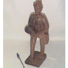 ESCULTURA EM ARGILA (32,5 CM). HOMEM CARREGANDO UMA SACOLA CHEIA DE CRISTAIS E UMA MORINGA. ENCONTRA-SE DESCALÇO, DE CHAPÉU, BERMUDA E CAMISA ABERTA. NA BASE, 'GARIMPEIRO / PATRICIO / ITINGA / MG'.