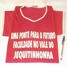CAMISETA (TAM GG) EM MALHA VERMELHA, COM DETALHES BRANCOS, DE MANGA CURTA. NA FRENTE, EM BRANCO, 'UMA PONTE PARA O FUTURO / FACULDADE NO VALE DO JEQUITINHONHA'.