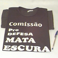 CAMISETA (TAM NÃO IDENTIFICADO) EM MALHA VERDE, DE MANGA CURTA. NA FRENTE, ESTAMPA EM BRANCO, 'COMISSÃO PRO DEFESA MATA ESCURA'. ATRÁS, 'JEQUITINHONHA - MG'.