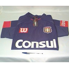 CAMISA DE FUTEBOL (TAM GG) DO TIME A.D. SÃO CAETANO. CAMISA AZUL COM FAIXAS LATERAIS NA COR VERMELHA. NA FRENTE, BRASÃO DO TIME E 'W / CONSUL'. ATRÁS, 'CONSUL / 10 / WILSON'.