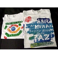 DUAS CAMISETAS BRANCAS EM MALHA DE ALGODÃO. UMA, PINTADA EM TONS DE AZUL, VERDE E VERMELHO E TRAZENDO A INSCRIÇÃO, EM BRANCO, 'POR AMOR AO MUNDO PORTO ALEGRE PEDE PAZ! FÓRUM SOCIAL MUNDIAL 2003 - BRASIL'. A OUTRA, PINTADA EM VERDE, VERMELHO, LARANJA E AZUL E TRAZENDO A INSCRIÇÃO, EM BRANCO, 'III FÓRUM SOCIAL MUNDIAL / UM OUTRO MUNDO É POSSÍVEL / 2003 / BRASIL / PORTO ALEGRE'.
