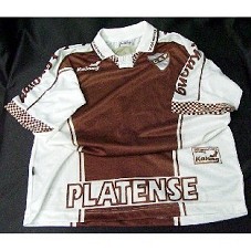 CAMISETA EM POLIÉSTER BRANCO, COM DETALHES MARROM, DO TIME DE FUTEBOL DA ARGENTINA 'CLUB ATLÉTICO PLATENSE - CAP', COM A INSCRIÇÃO 'LULA', EM CAMURÇA AMARELA, NAS COSTAS.