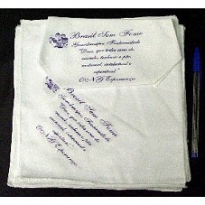 NOVE GUARDANAPOS (22X21 CM) EM MALHA DE ALGODÃO BRANCA, COM A INSCRIÇÃO EM AZUL 'BRASIL SEM FOME - GUARDANAPOS FRATERNIDADE - DEUS, QUE TODOS SERES DO MUNDO TENHAM O PÃO MATERIAL, INTELECTUAL E ESPIRITUAL. ONG ESPERANÇA'.