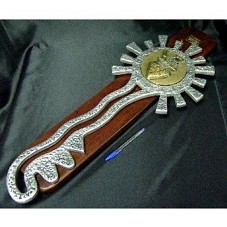 CHAVE (75X32CM) SIMBÓLICA DA CIDADE DE PORTO ALEGRE/RS, EM METAL PRATEADO, TRAZENDO EM SUA PARTE SUPERIOR UM CORAÇÃO, EM METAL DOURADO, COM UMA LUZ VERMELHA QUE FICA PISCANDO E UMA PLAQUETA EM METAL COM A ASSINATURA DO AUTOR E A INSCRIÇÃO ''A CHAVE' / FSM 2002 [FÓRUM SOCIAL MUNDIAL DE 2002] / PORTO ALEGRE'. APOIADA SOBRE TÁBUA DE MADEIRA (80X15X3CM).