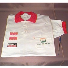 CAMISA PÓLO (TAM G) NA COR BRANCA, COM GOLA E ACABAMENTO DA MANGA EM VERMELHO. POSSUI UM BOLSO NA PARTE DA FRENTE E 'BR PETROBRAS', 'VIGILÂNCIA MÁXIMA' E 'ACIDENTE ZERO'.