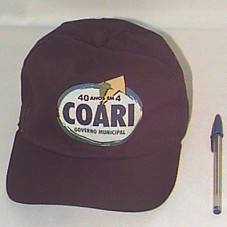 BONÉ EM BRIM AZUL MARINHO. NA FRENTE, ESTAMPA EM AZUL, BRANCO, VERDE E AMARELO 'COARI / 40 ANOS EM 4 / GOVERNO MUNICIPAL'.