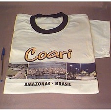 CAMISETA (TAM G) EM MALHA NA COR CREME, DE MANGA CURTA. GOLA EM MALHA PRETA. NA FRENTE, ESTAMPA COM TRÊS FOTOS E 'COARI / AMAZONAS - BRASIL'. ATRÁS, 'COARI / 40 ANOS EM 4 / GOVERNO MUNICIPAL'. ACONDICIONADA EM SACO DE TNT VERMELHO, COM MESMA ESTAMPA.