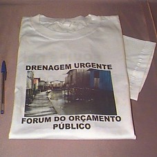 CAMISETA (TAM G) EM MALHA BRANCA, DE MANGA CURTA. NA FRENTE, ESTAMPA COM FOTO DE CASAS DE PALAFITA E 'DRENAGEM URGENTE / FORUM DO ORÇAMENTO PÚBLICO'. ATRÁS, 'EQUIPE DE MOBILIZAÇÃO DA CACHOEIRINHA'.