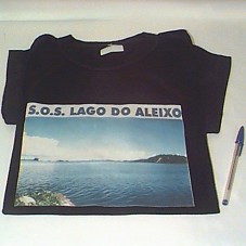 CAMISETA (TAM NÃO IDENTIFICADO) EM MALHA PRETA. NA FRENTE, ESTAMPA COM FOTO DE UM LAGO E 'S.O.S. LAGO DO ALEIXO'.