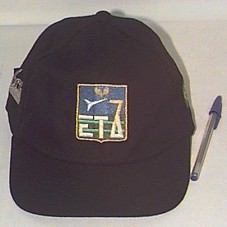 BONÉ EM BRIM PRETO. NA FRENTE, BORDADO, SÍMBOLO DO 'ETA 7' (SÉTIMO ESQUADRÃO DE TRANSPORTE AÉREO). NAS LATERAIS, 'COBRA' E A BANDEIRA DO BRASIL.