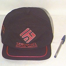 BONÉ EM BRIM PRETO. NA FRENTE, ESTAMPA VERMELHA, SÍMBOLO DO 'SERVIFÁCIL / REFEIÇÕES COLETIVAS'. NAS LATERAIS, 'O VERDADEIRO SABOR DA QUALIDADE' E 'WWW.SERVIFÁCIL.COM.BR / E-MAIL:[email protected]'.