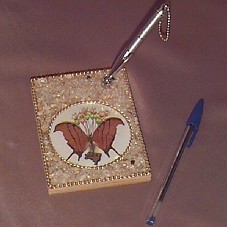 BLOCO DE ANOTAÇÕES (9,3X13 CM) COM CAPA E CONTRA-CAPA EM MDF. CAPA TRABALHADA COM PEDRAS, TENDO UMA BORBOLETA ENCAPSULADA COM FLORES NO CENTRO INFERIOR DA MESMA. POSSUI UMA CANETA EM METAL PRATEADO, COM TAMPA FIXADA NA PARTE SUPERIOR DA CAPA. NA CANETA, A GRAVAÇÃO, 'PRESIDENTE LULA'. ACONDICIONADO EM EMBALAGEM DE ACETATO TRANSPARENTE.