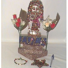ARTESANATO (32 CM) EM MADEIRA E PAPELÃO, COM ACABAMENTO EM PURPURINA, LANTEJOULA E MIÇANGAS. COMPOSIÇÃO DE UM PEDESTAL FORMADO POR QUADRADOS SOBREPOSTOS, TENDO NA BASE SUPERIOR A IMAGEM DO ROSTO DE CRISTO E UMA MEDALHA DE NOSSA SENHORA, POUSSUI UMA FITA DE NOSSA SENHORA APARECIDA E DOIS RAMOS DE ROSAS ARTIFICIAIS NAS LATERAIS. NA FRENTE, PLACA COM IMÃ E A INSCRIÇÃO 'LULA'. ACOMPANHA PULSEIRA DE MIÇANGAS COM MESMA MEDALHA E UMA DO ESPÍRITO SANTO; UMA ESTRELA EM MESMO MATERIAL E LANTEJOULAS, COM UM IMÃ NA PARTE POSTERIOR; E UM PEDAÇO DE PAPEL COM IDENTIFICAÇÃO DO REMETENTE E 'TRABALIO MEU TEM ATE CHILE'.
