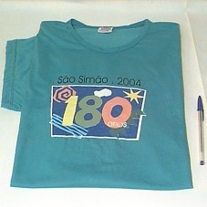 CAMISETA (TAM GG) EM MALHA AZUL, DE MANGA CURTA. NA FRENTE, ESTAMPA EM AZUL, VERDE, LARANJA E AMARELA E 'SÃO SIMÃO. 2004 / 180 ANOS'. ATRÁS, EM PRETO, 'SORRIA / FIQUE FELIZ / VOCÊ ESTÁ EM SÃO SIMÃO / VALE DA SAÚDE'.