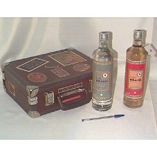 DUAS GARRAFAS DE CACHAÇA DA MARCA 'MITO BRASIL', DE 700 ML. UMA (LOTE 01, DE 24.04.2004) COM RÓTULO ACINZENTADO, 'CACHAÇA CRISTAL / PARA CAIPIRINHA'. A OUTRA (LOTE 07, DE 27.04.2004), DE RÓTULO AVERMELHADO, CACHAÇA PARA EXPORTAÇÃO. ACONDICIONADAS EM MALA ANTIGA (25,5X32X11 CM), CONFECCIONADA EM EUCATEX, NA COR MARROM, COM VÁRIOS ADESIVOS COLADOS.