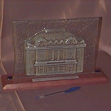 ESCULTURA EM VIDRO (27X3X19 CM), FACHADA DO TEATRO D. PEDRO II. FIXADA EM BASE DE MADEIRA (34X8,5X2,5 CM). NA FRENTE DA BASE, PLACA METÁLICA (15X1,5 CM) COM A GRAVAÇÃO 'TEATRO D. PEDRO II / RIBEIRÃO PRETO - SP / PROGRAMA RIBEIRÃO CRIANÇA'.