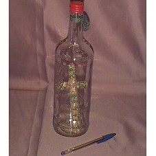 CRUZ (17 CM APROXIMADAMENTE) COBERTA POR PURPURINA DOURADA DE UM LADO, EM VERDE , 'LULA'; DO OUTRO, 'MARIZA'). condicionada emgarrafa de vidro (31 CM) TAMPA VERMELHA E UMA FITA DO SENHOR DO BONFIM AMARRADA NO GARGALO.