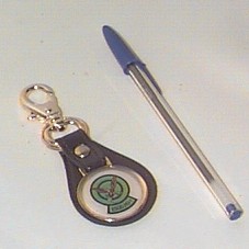 CHAVEIRO EM COURO E METAL DOURADO (10,5 CM), COM SÍMBOLO DO 'ESQUADRÃO HU-1' (DESENHO DE UMA ÁGUIA SEGURANDO UM OBJETO, INSCRITO EM CÍRCULOS VERDES).