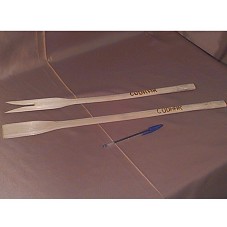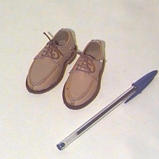 PAR DE MINI SAPATOS (8 CM) MASCULINO, EM COURO, NA COR OCRE. NA SOLA, A INSCRIÇÃO, 'COURO LEGÍTIMO'.