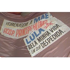 FAIXA (412X70 CM) EM TNT BRANCO. POSSUI A INSCRIÇÃO 'HOMENAGEM A MÃE DO PRESIDENTE LULA / HOSP. PRINCIPE HUMB. / MINHA MÃE, MINHA ESTRELA, MINHA VIDA, EU ESTAVA PRESENTE EM SUA DESPEDIDA.', NAS CORES AZUL, VERMELHO E PRETO.
