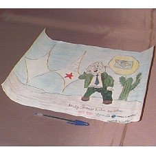 DESENHO (TAM A3) EM FOLHA SULFITE BRANCA. DESENHO DO PRESIDENTE LULA, AO LADO DE UM MANDACARU, TENDO DO LADO ESQUERDO, SÍMBOLO DO PALÁCIO DO ALVORADA, COM A INSCRIÇÃO 'LULA LA / BRILHA UMA ESTRELA / LULA LA / ESSA É A ESPERANÇA...'. DENTRO DO SOL, A BANDEIRA BRASILEIRA. NO CANTO INFERIOR DIREITO, 'LUIZ INACIO LULA DA SILVA / FOME ZERO / BRASIL / ORDEM E PROGRESSO / IAÇANÃ TERICATTO'.