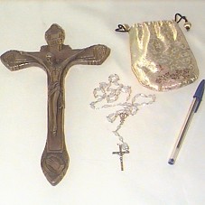 CRUCIFIXO EM METAL COBREADO (28X16X4 CM) COM JESUS E A INSCRIÇÃO 'INRI'. ACOMPANHA SACO EM CETIM DOURADO COM DESENHOS DE FLORES, ACONDICIONANDO UM TERÇO EM MADREPÉROLA AZULADA. ACOMPANHA CARTÃO DE VISITA DO REMETENTE, COM INSCRIÇÃO EM CHINÊS E 'AO CASAL LUIS INÁCIO E MARISA, FELICIDADES E QUE DEUS OS ABENÇOE SEMPRE! 26/05/2004'.