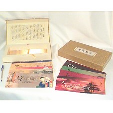 COLEÇÃO DE DEZ LIVRETOS DE CARTÕES POSTAIS DA SÉRIE PALÁCIO IMPERIAL DA CHINA (IMPERIAL PALACE OF CHINA). CADA UM ABORDANDO ASSUNTO DIFERENTE, ENTRE, ARQUITETURA, SELOS, RELÓGIOS, BRONZES, JÓIAS, PINTURAS, CERÂMICAS, IMPERADORES, TEATRO E TESOUROS. ACONDICIONADOS, EM GRUPO DE CINCO, EM CAIXAS (31X16,5X4 CM) FORRADAS DE TECIDO AMARELO-DOURADO, COM IDEOGRAMAS CHINESES NA PARTE SUPERIOR.