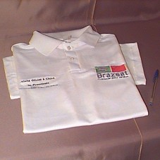 CAMISA GOLA PÓLO (TAM GG), NA COR BRANCA, DE MANGA CURTA. NA FRENTE, NO LADO SUPERIOR ESQUERDO, A BANDEIRA DO BRASIL E DA CHINA E 'BRAZSAT / COMMERCIAL SPACE SERVICES'. NO OUTRO LADO, 'VISITA OFICIAL À CHINA DO PRESIDENTE LUÍS INÁCIO LULA DA SILVA'. ATRÁS, 'WWW.BRAZSAT.COM.BR'.