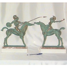 ESCULTURAS EM BRONZE (31,5 CM). FIGURA DE DOIS GUERREIROS (UM HOMEM E UMA MULHER ) NUS, MONTADOS À CAVALO, EM POSIÇÃO DE ATAQUE. O HOMEM SEGURA UMA LANÇA (ENCAIXADA EM UMA DAS MÃOS) E UM ESCUDO COM FIGURA DE UM PÁSSARO, COM ELMO NA CABEÇA. A MULHER, UMA ADAGA, ESCUDO COM FIGURA DE UM ROSTO HUMANO E ELMO. AMBAS FIXADAS EM BASE (24X9X4 CM) DE MÁRMORE BRANCO. ESCULTURAS ESVERDEADAS, COM PARTES POLIDAS EM TOM DE DOURADO. ACONDICIONADAS EM CAIXAS SEPARADAS, NA COR VERDE, E ESTAS EM CAIXA (25,5X40X38 CM) COM ALÇA, NA MESMA COR. ACOMPANHA CARTÃO DO REMETENTE.