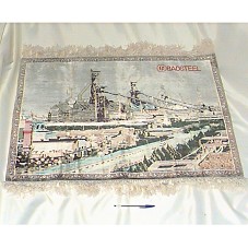 TAPETE (91X62 CM) COM FRANJAS NA COR BEGE EM DUAS EXTREMIDADES. POSSUI DESENHO DA EMPRESA/USINA 'BAOSTEEL' E RESPECTIVA INSCRIÇÃO. PREDOMINA OS TONS DE VERDE, PRATA, CREME E AZUL. ACONDICIONADO EM CAIXA (37X25,5X12,5 CM) FORRADA DE TECIDO VERMELHO.