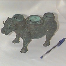 ESCULTURA EM BRONZE (20,5X7X12 CM), COM NUMERAÇÃO DE 005/09801. AQUECEDOR DE VINHO EM FORMATO DE BÚFALO. TEM EM SEU DORSO TRÊS ABERTURAS, SENDO QUE NA DO MEIO HÁ UM RECIPIENTE PARA O VINHO. AS OUTRAS DUAS ABERTURAS SÃO CONECTADAS PELA INTERIOR DO CORPO, PARA COLOCAÇÃO DE ÁGUA QUENTE. A PEÇA ORIGINAL FAZ PARTE DA COLEÇÃO DO MUSEU DE XANGAI. ACOMPANHA INFORMATIVO SOBRE A PEÇA, EM INGLÊS E CHINÊS. ACONDICIONADA EM CAIXA (28X20X9,5 CM) FORRADA DE TECIDO ESVERDEADO.
