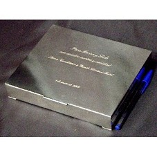 CHARUTEIRA (32X202X173MM) EM PRATA, COM ACABAMENTO INTERNO EM MADEIRA, TRAZENDO NA TAMPA A INSCRIÇÃO 'PARA MARISA Y LULA / CON NUESTRO CRIÑO Y AMISTAD / LÁZARO GUAUHTÉMOCY Y CAMILA CÁRDENAS BATEL / 1 DE ENERO DE 2003'.