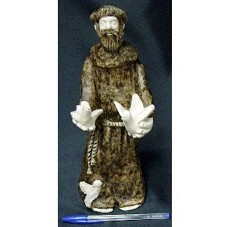 ESCULTURA DE SÃO FRANCISCO DE ASSIS SEGURANDO UM POMBO EM CADA UMA DAS MÃOS E OUTRO POMBO POUSADO EM SUA TÚNICA.