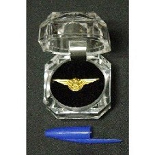 BÓTON, EM METAL DOURADO, RETRATANDO AS ASAS SÍMBOLO DA AERONÁUTICA. ACONDICIONADO EM ESTOJO DE ACRÍLICO TRANSPARENTE.
