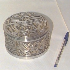 PORTA JÓIAS (13X7 CM) EM ESTANHO, DE BASE CIRCULAR. POSSUI GRAVAÇÕES DE DESENHOS NA TAMPA E NAS LATERAIS, TENDO COMO SÍMBOLO A MÁSCARA DO URSO DO POVO HAIDA. ACOMPANHA INFORMATIVO EM INGLÊS E FRANCÊS, 'TRADITIONAL HAIDA BEAR MASK MOTIF'. NO INTERIOR DA TAMPA, A GRAVAÇÃO, 'BOMA PEWTER'. ACONDICIONADO EM CAIXA PRETA (13,5X13,5X8 CM).