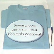 CAMISETA (TAM G) EM MALHA AZUL, DE MANGA CURTA. NA FRENTE, ESTAMPA COM A INSCRIÇÃO 'SEMANA COM PEIXE NA MESA FICA MAIS GOSTOSA!'. ATRÁS, 'SECRETARIA ESPECIAL DE AQÜICULTURA E PESCA / BRASIL UM PAÍS DE TODOS'.