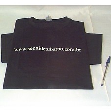 CAMISETA EM MALHA PRETA (TAM GG), DE MANGA CURTA. NA FRENTE, ESTAMPA BRANCA, 'WWW.SENAIDETUBARAO.COM.BR'; ATRÁS, 'SENAI É PARA APAIXONADOS'.