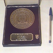 MEDALHA (8,5 CM) EM BRONZE. NA FRENTE, BRASÃO COM DESENHO DE UMA ÁGUIA E 'FORÇA AÉREA PORTUGUESA / EX MERO MOTU'. NO VERSO, 'DEPÓSITO GERAL DE MATERIAL DA FORÇA AÉREA / ALVERCA / E DO MAIS NECESSÁRIO VOS PROVEJA'. ACOMPANHA BÓTON (1,3X1,8 CM) EM METAL DOURADO, NO FORMATO DO BRASÃO GRAVADO NO VERSO DA MEDALHA. DESENHO DE UMA BOLSA EM VERMELHO, COM ARCO E FLECHAS EM DOURADO, COM COROA NO CIMO DO BRASÃO. ACONDICIONADOS EM CAIXA AZUL (12,2X16,5 CM). NO INTERIOR DA CAIXA, PLACA DOURADA COM A INSCRIÇÃO 'AO PRESIDENTE DA R.F.B. LULA DA SILVA / COM AMIZADE DO SMOR/BARATA / PORTUGAL 04-05-28'.