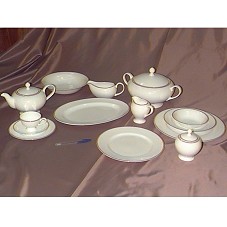 CONJUNTO DE LOUÇAS, COMPOSTO POR: SEIS XÍCARAS E SEIS PIRES; SEIS PRATOS RASOS DE SOBREMESA; SEIS PRATOS MÉDIOS FUNDOS; UM AÇUCAREIRO; UM MOLHEIRO; UMA LEITEIRA; UM BULE; SEIS TIGELAS FUNDAS PEQUENAS; UMA TRAVESSA REDONDA RASA; UMA TRAVESSA OVAL FUNDA; SEIS PRATOS RASOS; DUAS TRAVESSAS FUNDAS; E, UMA SOPEIRA. TODOS EM PORCELANA BRANCA COM DETALHES DE LISTRAS DOURADA, VERMELHA E VERDE NAS BORDAS. NO FUNDO DE CADA PEÇA, 'WITH THE COMPLIMENTS OF BEGUM KHALEDA ZIA / PRIME MINISTER / GOVERNMENT OF THE PEOPLE'S REPUBLIC OF BANGLADESH'. ACOMPANHA CARTÃO COM MESMA INSCRIÇÃO. ACONDICIONADOS EM CAIXAS BRANCAS E ESTAS EM CAIXA DE PAPELÃO BRANCA.