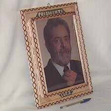 QUADRO (28X34,3 CM) COM FOTO (19X25,3 CM) DE REVISTA DO PRESIDENTE LULA. MOLDURA ARTESANAL EM MADEIRA, COM DESENHOS EM SEMI-CÍRCULOS GRAVADOS. POSSUI A INSCRIÇÃO 'PRESIDENTE LULA'.