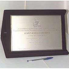 PLACA (29X20,5 CM) EM METAL PRATEADO FOSQUEADO, COM BORDAS POLIDAS. POSSUI A INSCRIÇÃO 'A ASSEMBLÉIA LEGISLATIVA DO ESTADO DA BAHIA CONFERE AO EXCELENTÍSSIMO SENHOR PRESIDENTE DA REPÚBLICA FEDERATIVA DO BRASIL / LUIZ INÁCIO LULA DA SILVA / O TÍTULO DE CIDADÃO BAIANO / PROJETO DA DEPUTADA MOEMA GRAMACHO / RESOLUÇÃO Nº 133/2003 / SALVADOR, 07 DE JUNHO DE 2004 / ... / DEPUTADO GABAN / PRESIDENTE'. ACONDICIONADA E FIXADA EM CAIXA (36X25,5X2,5 CM) FORRADA DE VELUDO PRETO.