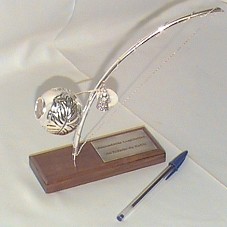 ESCULTURA DE UM BERIMBAU (19 CM) EM METAL PRATEADO, COM UMA MOEDA DE '2 CRUZEIROS' E UM SINO PENDURADOS NELE. FIXADA EM BASE DE MADEIRA (15,5X6X1,5 CM). NA BASE, PLACA METÁLICA COM A GRAVAÇÃO 'ASSEMBLÉIA LEGISLATIVA DO ESTADO DA BAHIA'. ACONDICIONADA EM CAIXA BRANCA (22X25X5,5 CM) COM TAMPA PRETA. ACOMPANHA CARTÃO DO REMETENTE, 'COM OS CUMPRIMENTOS DO DEPUTADO GABAN / PRESIDENTE'.
