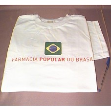 DUAS CAMISETAS (TAM G) EM MALHA BRANCA, DE MANGA CURTA. NA FRENTE, DESENHO DA BANDEIRA DO BRASIL E 'FARMÁCIA POPULAR DO BRASIL'. ATRÁS, 'APOIO / MINISTÉRIO DA SAÚDE / BRASIL UM PAÍS DE TODOS / GOVERNO FEDERAL'.