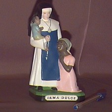 IMAGEM DA IRMÃ DULCE (17 CM), COM O TERÇO NA MÃO, SEGURANDO UMA CRIANÇA NEGRA,E, TENDO AOS SEUS PÉS, UMA MULHER NEGRA AJOELHADA. NA FRENTE DA BASE, 'IRMÃ DULCE'. ATRÁS, NA ROUPA DELA, 'RUBEN MARTINS / JUNHO 2004', E AS INICIAIS DO AUTOR GRAVADAS. ACONDICIONADA EM CAIXA DE PAPELÃO PARDO (10X22X10 CM). NA PARTE INTERNA DA TAMPA, '1ª IMAGEM AUTORIZADA DE IRMÃ DULCE / CRIADA E EXECUTADA PELO ARTISTA PLÁSTICO RUBEN MARTINS / SALVADOR, 07/06/04'.